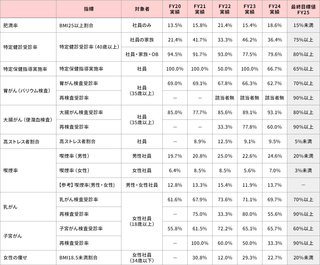 JALグループ健康増進プロジェクト「JAL Wellness 2025」で策定された指標をベースに、「生活習慣病」「がん」「メンタルヘルス」「たばこ対策」「女性の健康」を重点課題として定めています。 当社は、Wellness事務局(JALウエルネス推進部・健康保険組合)から毎年提供される「Wellnessレポート」の結果を踏まえ、特に対策が必要な重点課題を以下に定め、取り組むこととしています。
