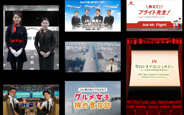 パイロットのスキルや日常、CA制服の歴史紹介、機内の安全ビデオ、機内用アナウンスメントなど、JALグループならではの知見を活かしたオリジナルコンテンツを企画・制作しています。